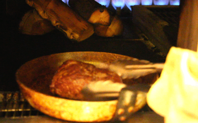 厨师将澳洲谷饲几百天的优质牛扒几度翻面烤炙均匀,我抬眼仔细看,焰火烧燎得还有一堆木块。这就是传说中的果木了,靠着热量的聚集,将果木香气渗透进入牛扒。