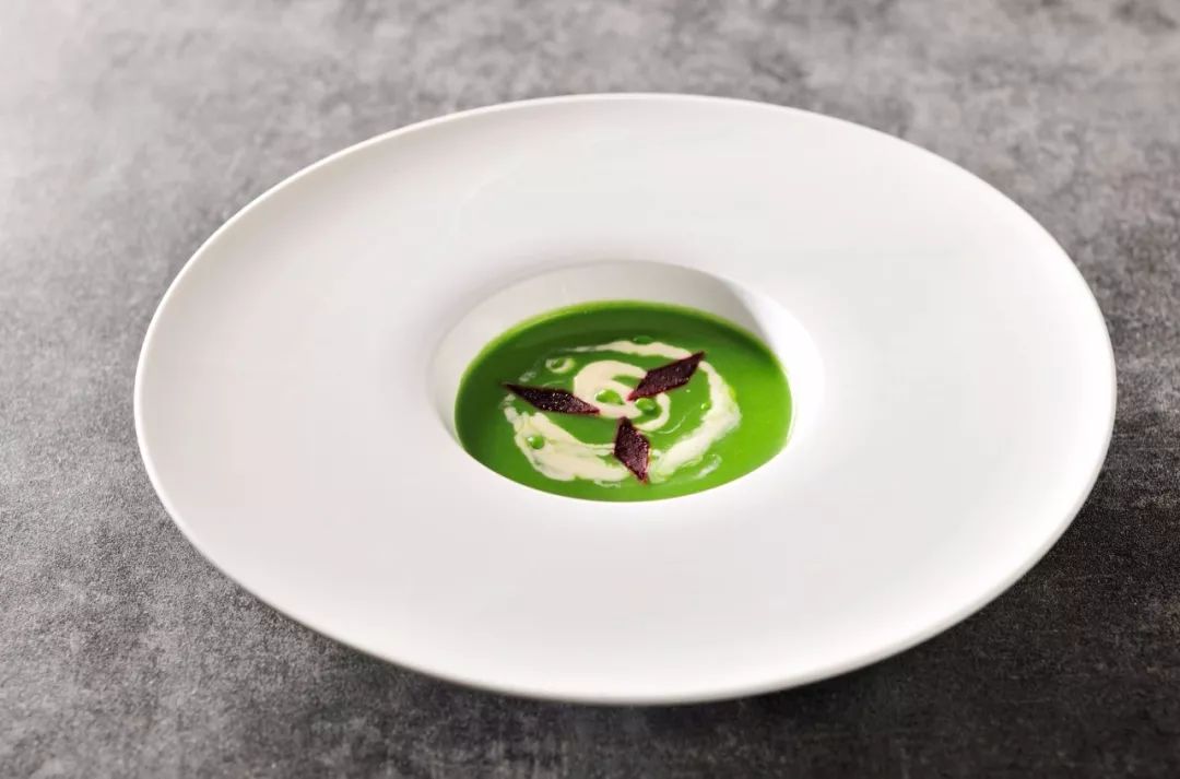青豆汤同样也是一款招牌汤品,里面有面包丁,红菜头,帕尔玛芝士泡沫打底,上桌后只要把青豆汁倒入碗中就可以开始食用了,味觉体验上,这款汤品的口感是最丰富的。