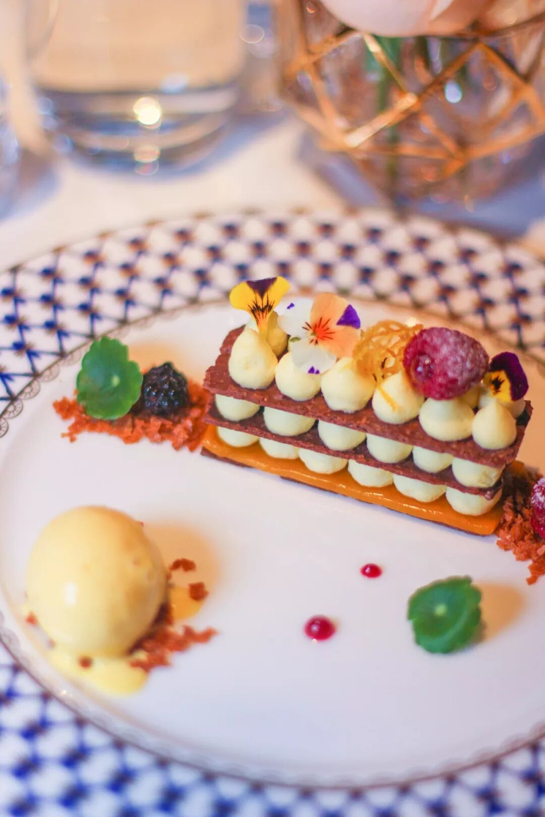 十分可爱的香槟慕斯塔,中间镶嵌着薄薄的巧克力威化,轻薄的慕斯如同睡在云朵上,甜蜜的巧克力增加了甜度的口感,一薄一厚相得益彰。