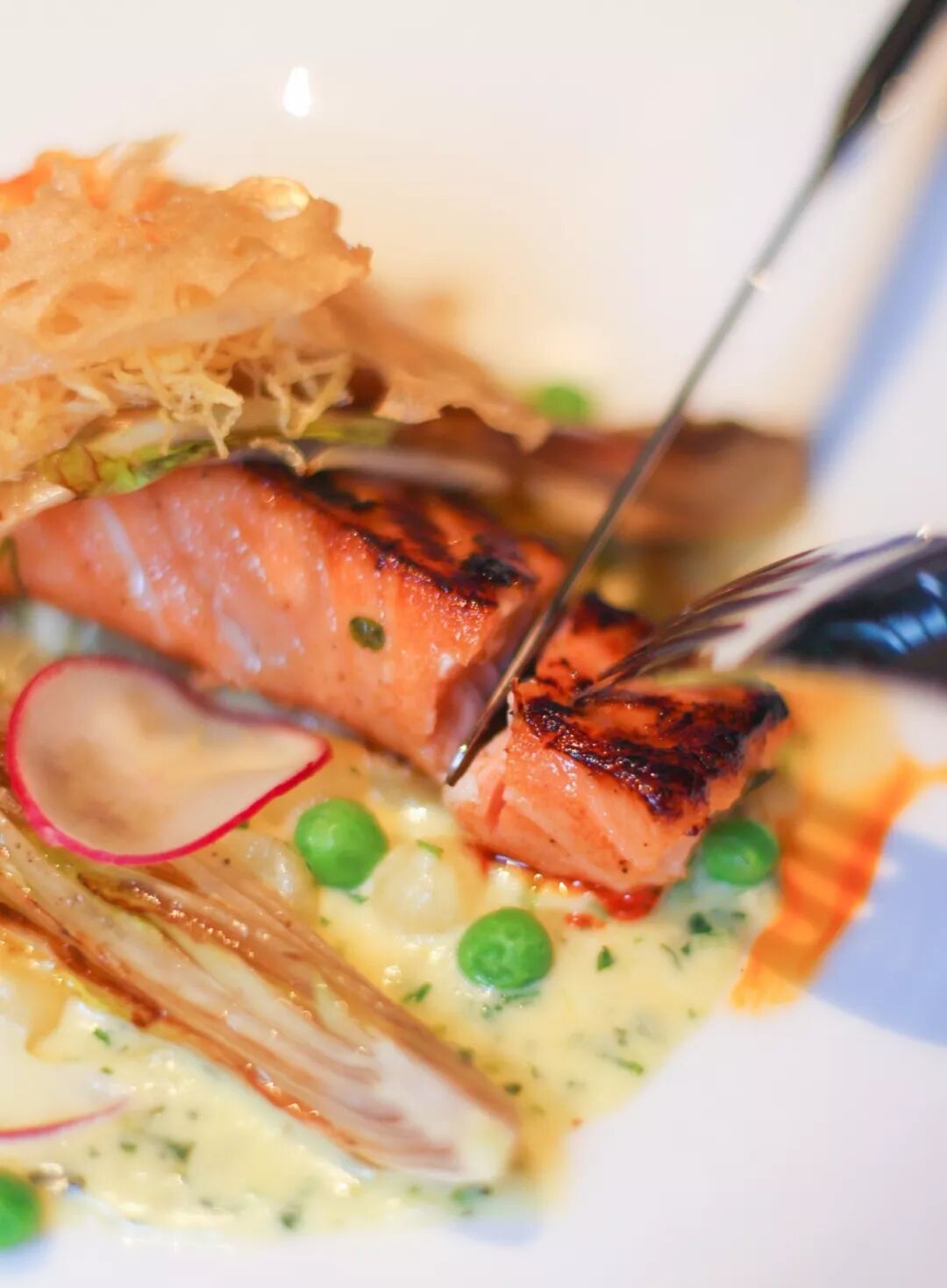 来自挪威的三文鱼品质很好,用烤箱炙烤成熟就是满鼻的香气,配上意式奶油小土豆和香脆藕片,只待蒜瓣一般的鱼香在口中慢慢弥散开。