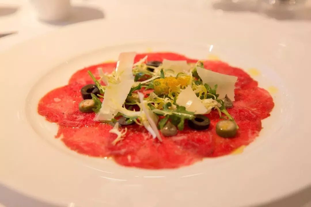 柔嫩的生牛肉,切成薄片,摆盘成花朵形状,肉片包裹着松露蛋黄酱,配上芝麻菜和小黄瓜,清口又爽脆。