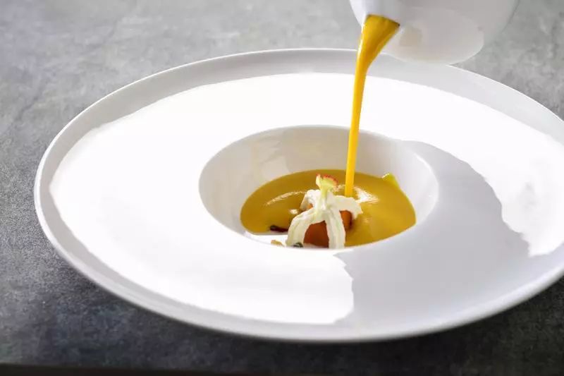 从白瓷壶里倒出的浓汤颜色十分好看,用新鲜南瓜熬煮的南瓜汤浓稠绵软,入口就是被亲吻的感觉。