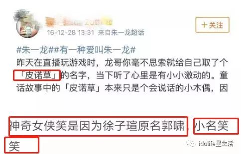 事情是这样婶儿滴,网瘾少年的某网友在吃鸡游戏时,发现了ID为“皮诺草”的朱一龙与ID为“神奇女侠笑”的徐子瑄经常一起组队玩 ↓