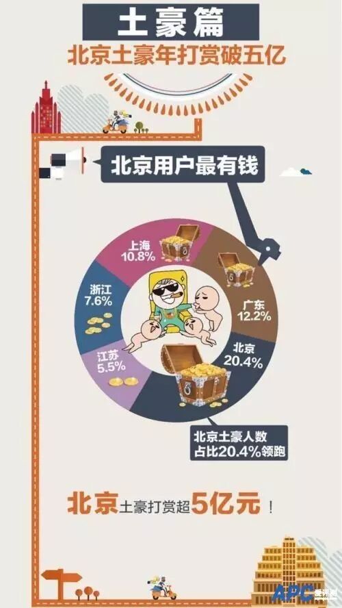 2)花椒直播近日发布的《花椒直播年度直播大数据》显示,北京、广东、上海、浙江、江苏等地盛产“土豪”(月打赏1万元以上),其中北京地区以土豪数最多,占比达20.4%,北京土豪一年打赏额则超过5亿元。