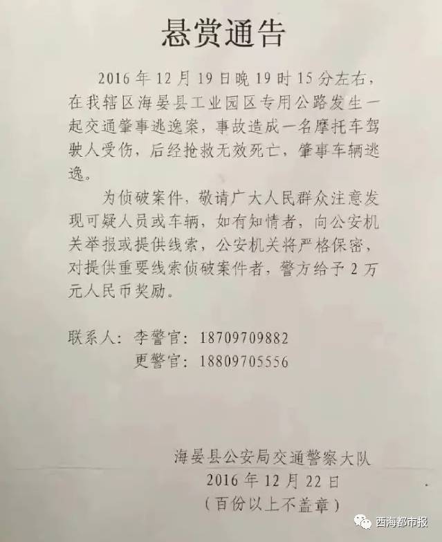5)2016年12月19日晚间,在海北州海晏县工业园区专用公路发生一起交通肇事逃逸事故。警方现发布悬赏通告,请广大群众提供线索,协助破案。
