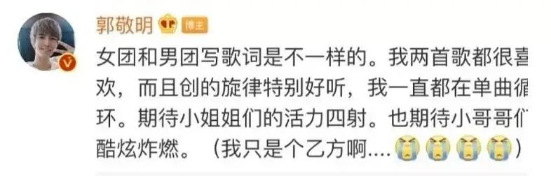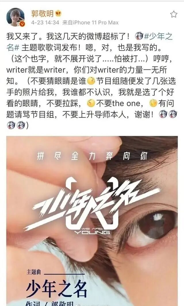之后,作为导师身份的郭敬明还在社交平台上宣传起自己为节目写的歌,感慨为了节目微博超标,看的出来郭敬明很是用心。