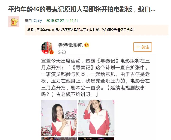 “香港电影已死”这句话在坊间流传多年,对或不对见仁见智。只不过,近来接连传出众多香港经典IP将会重启,由王晶担任编剧翻拍周星驰的经典之作《唐伯虎点秋香》已经在优酷独家上映,当前豆瓣评分仅为2.8分,而经典电视剧《寻秦记》也将被翻拍成电影并由原班人马演绎,据香港电影吧透露该片预计在今年三月底开拍。