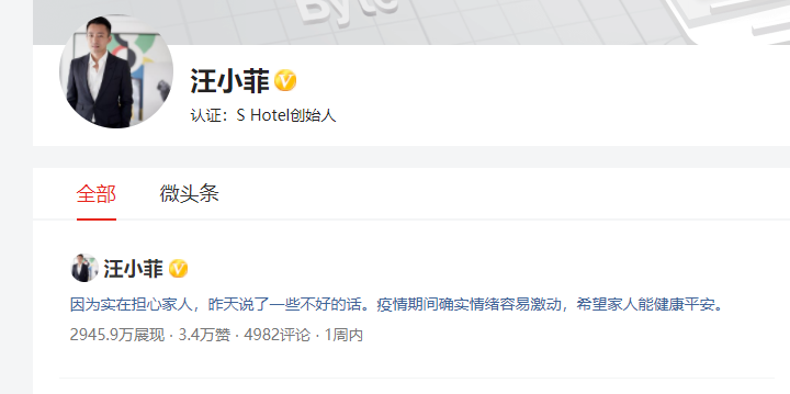 之后汪小菲公开道歉称疫情期间,因为担心家人的健康,情绪激动了一些,所以说了一些不该说的话。