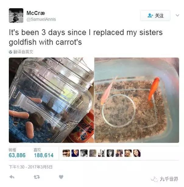 推上的一位老哥,为了测试妹妹有没有好好照顾鱼,贱兮兮地把妹妹养的两条小金鱼换成了胡萝卜,结果三天过去了……妹妹完全木有发现……到今天为止已经6天了,两条胡萝卜依然安详地呆在妹妹的鱼缸里。两条小金鱼则在哥哥的鱼缸里安了家,一副完全不想走的样子。