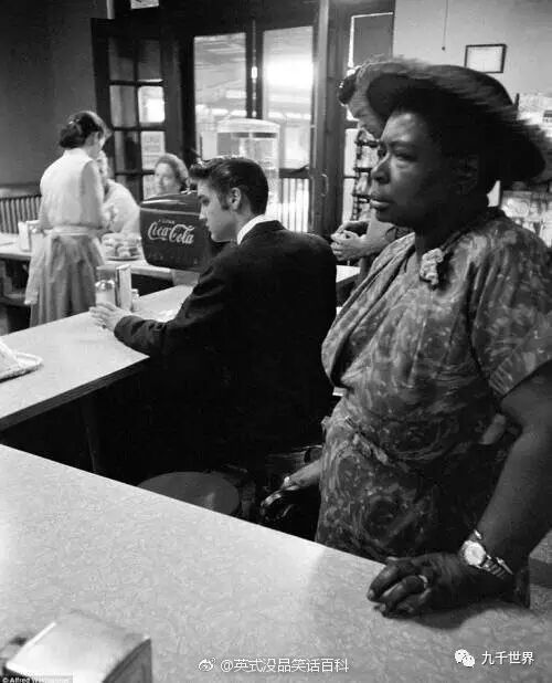 1956年,猫王正坐着等待自己的烟肉和煎蛋,黑人妇女站着等待自己的三明治,她不被允许坐下。 ——9GAG