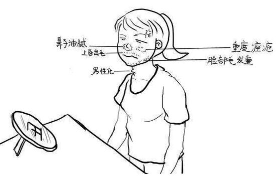 3、身体多毛:身体体毛丰盛,阴毛呈男性分布,油性皮肤痤疮,系雄激素集聚所致。