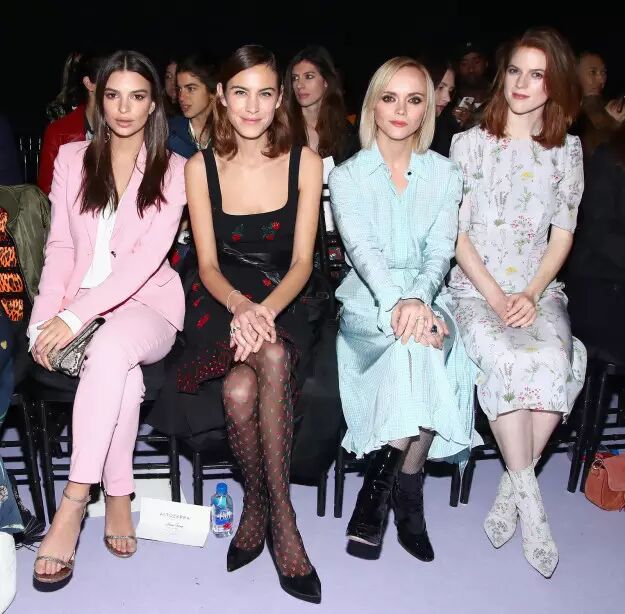 Emily Ratajkowski,Alexa Chung,Christina Ricci,Rose Leslie这四个人的穿搭,坐在一起让人看着就舒服。全都是上下顺色的穿搭,也都没有任何多余的饰品,好希望前排全是这样的造型啊,就可以少一些辣眼睛又喧宾夺主的噩梦了。