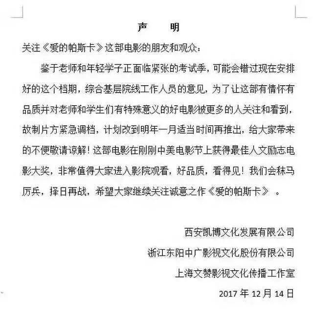 对此,制片方回应:鉴于老师和年轻学子正面临紧张的考试季,可能会错过现在安排好的这个档期,综合基层院线工作人员的意见,为了让这部有情怀有品质并对老师和学生们有特殊意义的好电影被更多的人关注和看到,故制片方紧急调档,计划改到明年一月适当时间再推出。