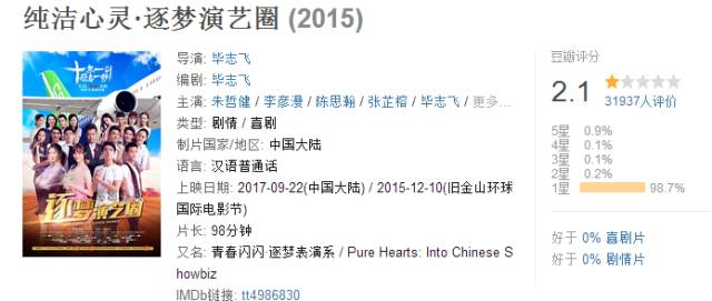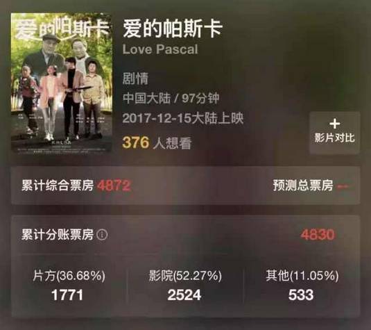 就连网友群嘲的《逐梦演艺圈》票房都有226.7万,是这部电影的560倍。而且《逐梦演艺圈》在豆瓣上还有2.1分,《爱的帕斯卡》却没有评分。