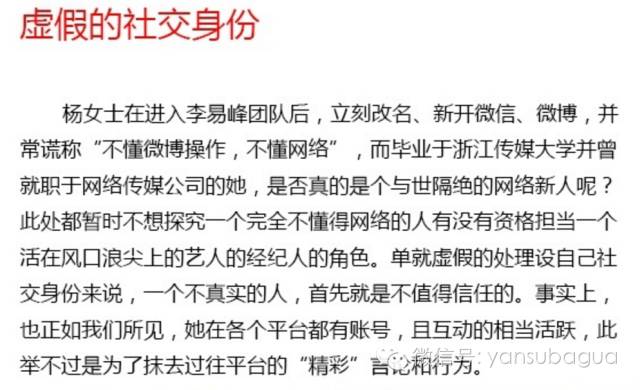 首先是针对经纪人个人,指出她没有太多从业经验就担任李易峰经纪人,而之后又伪装自己的社交身份,更是以李易峰多年同学、好友自居,而粉丝发现她和李易峰之前没有来往的迹象。