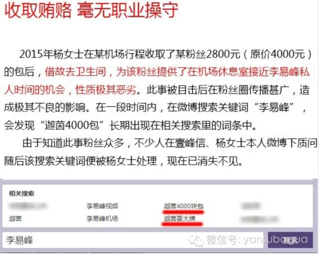 据粉丝爆料,杨迦茵还曾经被粉丝以4000元的包收买,擅自让粉丝见李易峰,被粉丝圈很多人都知道,而还有“迦茵4000包”的关键词,而这个关键词也不见了(就4000块钱……值当么……)