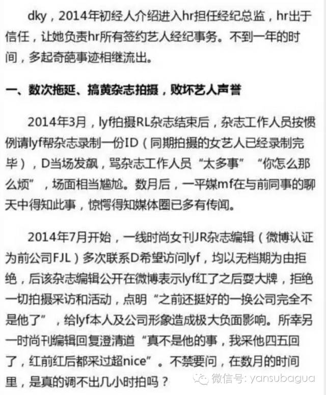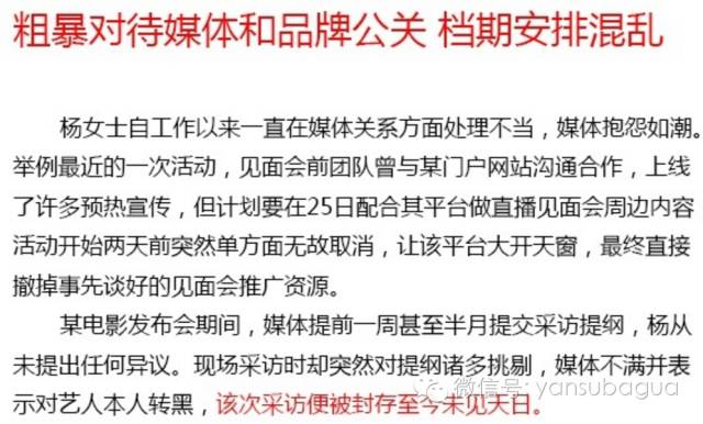 第二条涉及艺人形象和商业活动的维护,粉丝指出杨迦茵常常安排不合理,导致媒体对李易峰多有怨言,比如无故取消活动、干涉采访等等。