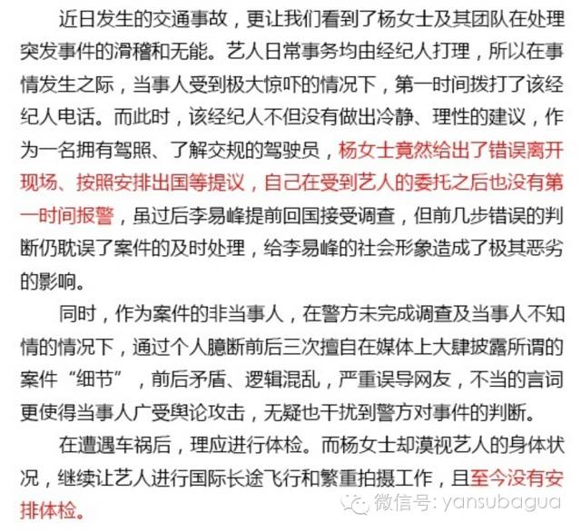 以及见面会、代言等多次乌龙事件,而最近的【李易峰车祸事件】,也成为粉丝攻击的重点。粉丝认为,当时李易峰自己私自离开现场并出国,引发了当时舆论的争议,而他之所以没有能够恰当处理,是因为杨迦茵作为经纪人没有给出恰当的建议和安排,甚至还没有给李易峰安排体检,不关心他的身体状况