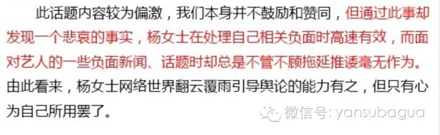 而这件事可以得出“杨迦茵及其团队并不是没有公关能力,只是对于自己的话题总比对艺人上心”的结论……(注意,这篇文章的措辞非常谨慎,在提出这个话题的时候还表示“此话题较为偏激,我们本身并不鼓励和赞同”……