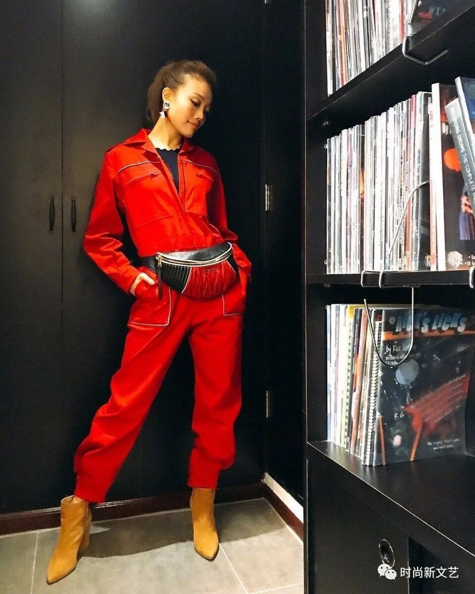 一件黑色T恤搭配红色连体工装,显得她的身材高挑又苗条。脚踩鹅黄色丝绒短靴。腰间的黑色腰包非常个性,双手插兜,站姿非常帅气。