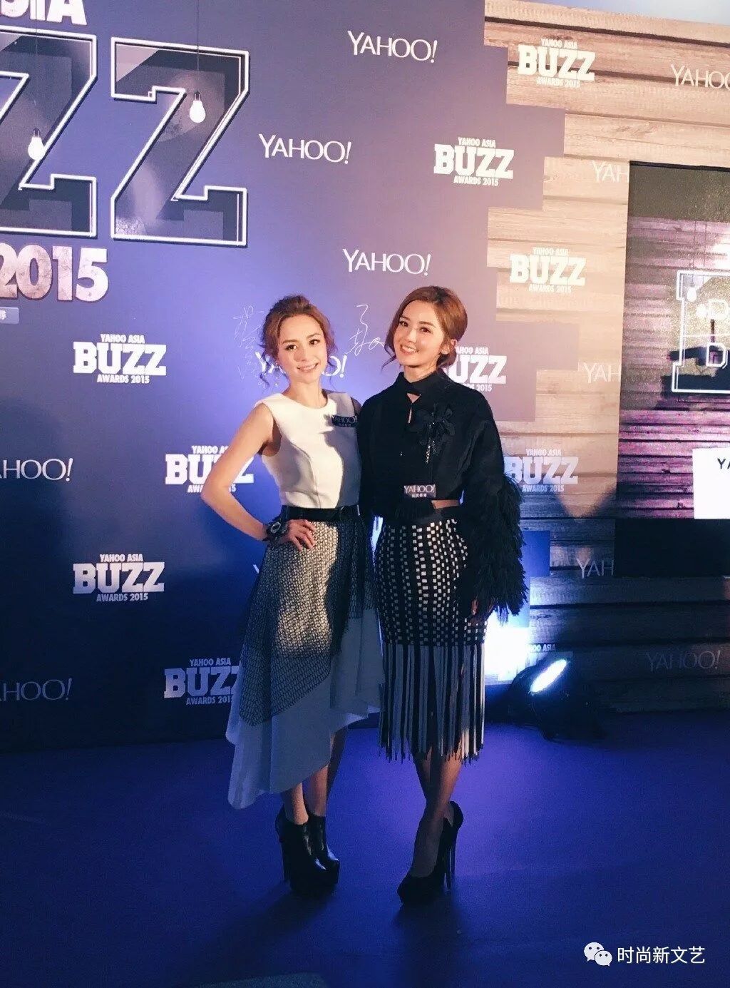 阿娇身着白色圆领上衣,搭配黑色半身长裙,脚踩黑色短靴。身边的阿Sa吹按着黑色上衣,搭配黑色半身裙。两人都是带着甜美的笑容并肩而站,非常美丽。