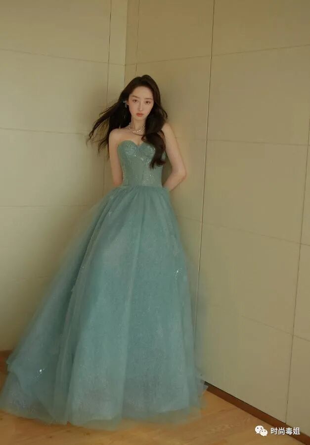 这次蒋梦婕就穿着一袭灰绿色抹胸裙出镜,版型款式很有设计感,裙领部分采用聚拢式效果,勾勒出迷人身形曲线,搭配锁骨链精致漂亮;裙摆宽长,采用透纱面料更显优雅飘逸。