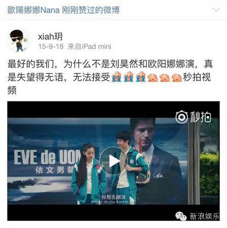 关键在刘昊然和谭松韵拍戏期间,欧阳娜娜还点赞过一条微博,内容是:为什么不是刘昊然和欧阳娜娜演!网友都说欧阳娜娜吃醋了....