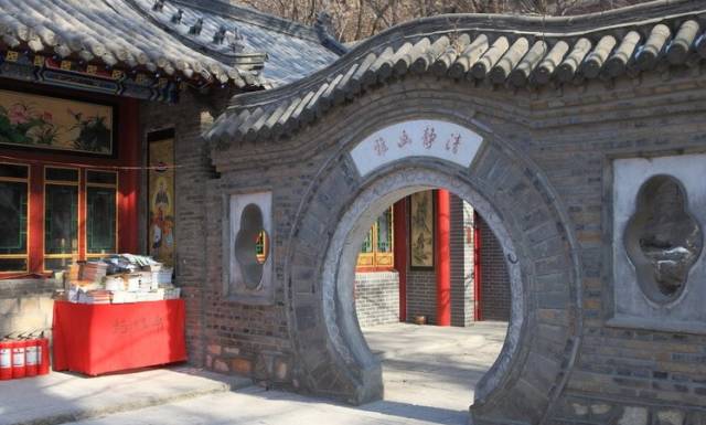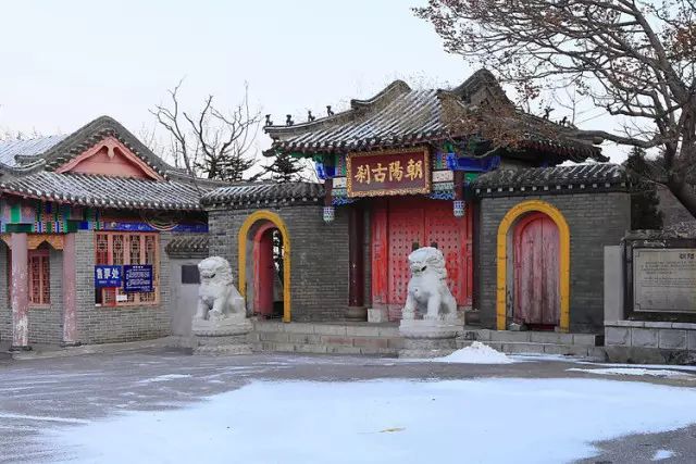 整个寺院坐北朝南,前、后山门建于两丘之巅,从整体上看,就好似后背一座山,前抱一座山,因此人们用负阴抱阳来形容它。在千里冰封的隆冬季节,雪光使树木、山门、禅房、殿堂更加妖娆夺目。此即是金州在古八景之一的“朝阳霁雪”。