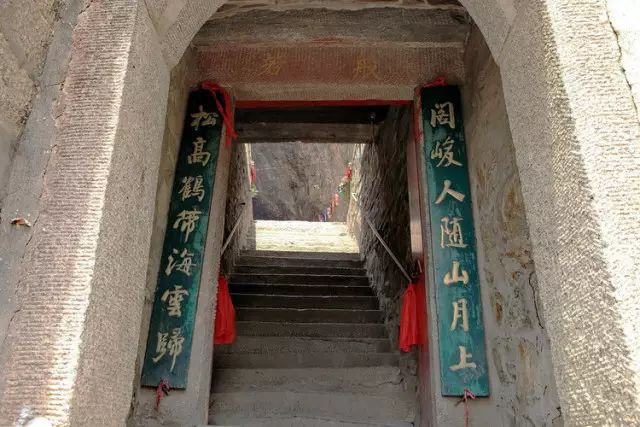 寺院最上面的庭院,被一个巨大的天然山洞所半吞。洞内建有正殿三楹,未用一块木料,故称“无梁殿”。殿内供奉释迦牟尼佛、阿弥陀佛和药师佛等。正殿前方有百佛塔香炉,香炉的前面,也是正殿的南侧,有一歇山式楼阁,建于巨石形成的悬崖之上,这就是观音阁,也称南阁。