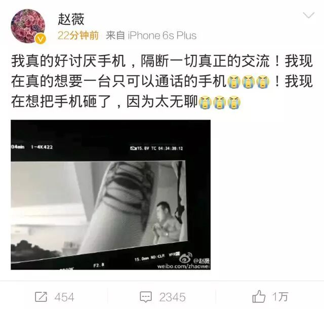 “我真的好讨厌手机,隔断一切真正的交流!我现在真的想要一台只可以通话的手机[泪][泪][泪]!我现在想把手机砸了,因为太无聊[泪][泪][泪] ”