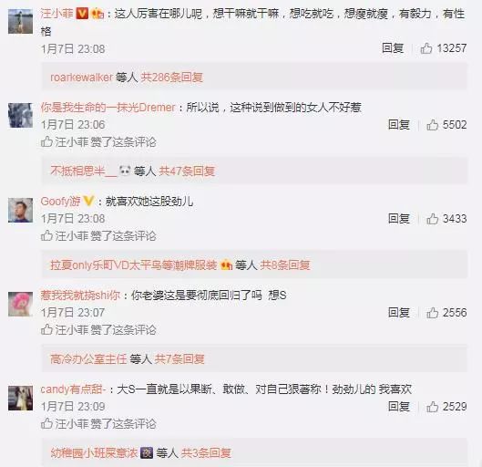 网友们一水在微博下评论喜欢这样“果断、敢做”说到做到的大S,老公汪小菲也骄傲地评论网友说,“这人厉害在哪儿呢,想干嘛就干嘛,想吃就吃,想瘦就瘦,有毅力,有性格”。