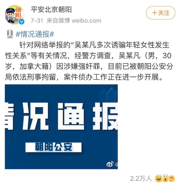 在全民关注下,7月31日,平安北京朝阳针对网络举报的“吴亦凡事件”进行了情况通报。