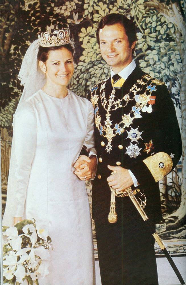▲1976年西尔维娅皇后与瑞典国王大婚佩戴浮雕镶嵌珍珠钻冕