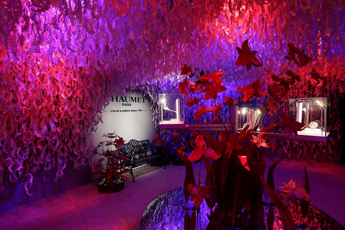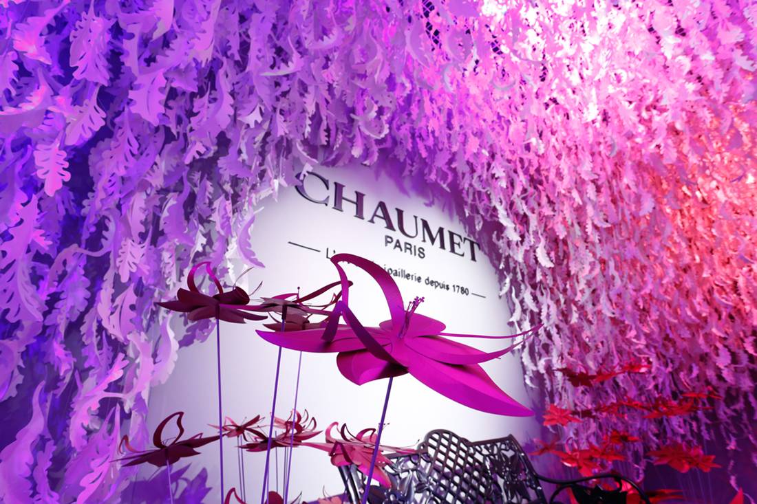 ▲这是CHAUMET的经典主题百合,纸花上的灯光还会随着时间一起变换,让现场呈现不同的气氛。