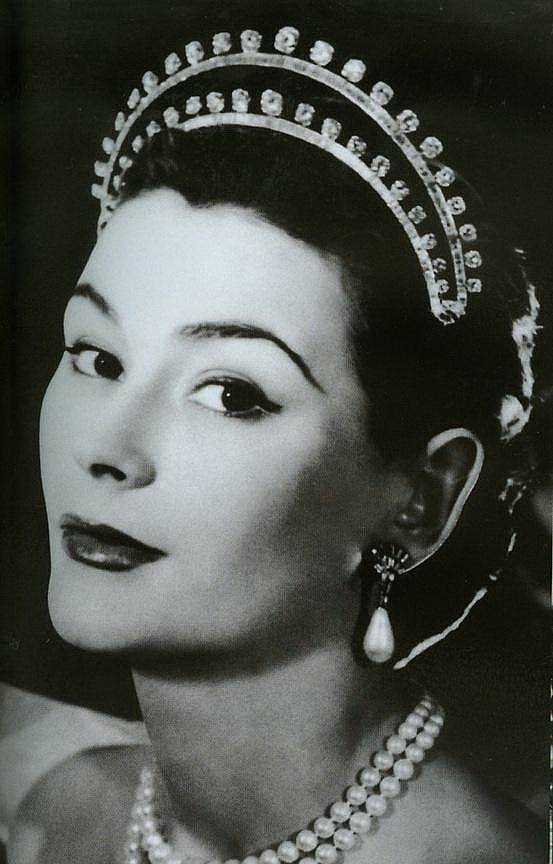 ▲1953年,当时的名模Anna Gunning 佩戴一只可拆卸做项链的CHAUMET钻冕,尊贵不凡。