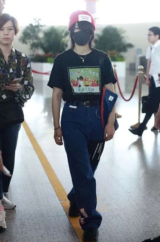 一款宽松的黑色T恤,胸前的复古印花,让整个人充满了潮流气质,下半身更是搭配黑色宽松阔腿裤,把上半身的黑色T恤塞进裤子里,再搭配一款腰带,在遮肉的同时又显瘦,绝对的前卫时尚!再选择一款有设计感的红色线条布包,这样的一身可以堪称嘻哈女孩的完美穿搭!
