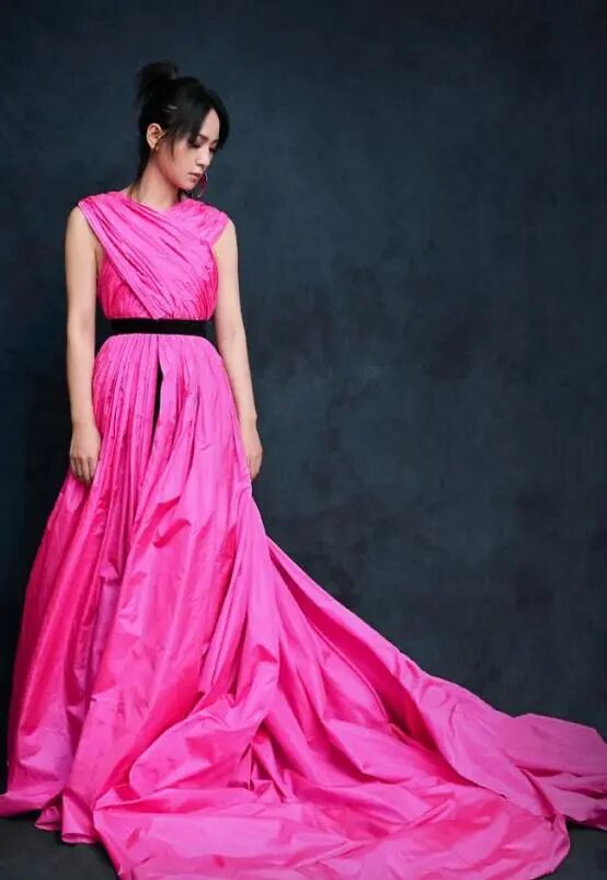 在舞台上的周笔畅更是多变的时尚体。只见一款玫红色的超长礼裙,玫红色的色调,不仅让周笔畅从人群中非常亮眼,更是衬托着周笔畅的皮肤更加的白皙,腰间的黑色腰带更是让整体有了层次感,也让周笔畅纤细的腰肢凸显出来,再搭配上超大的裙摆,简直就是高贵典雅的代表!