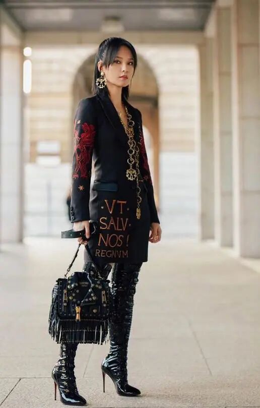 一款超级紧身的长款风衣,双臂上的红色刺绣设计,不仅让整件衣服充满了质感,更是让双臂显得更加的修长,V领的设计让整个人完美的锁骨线一览无余。v领处的立体金属链条设计,更是让整件衣服非常的与众不同。再搭配上脚下一双超高跟的闪亮皮鞋,性感又充满气场,这样的周笔畅差点让人认不出!
