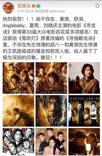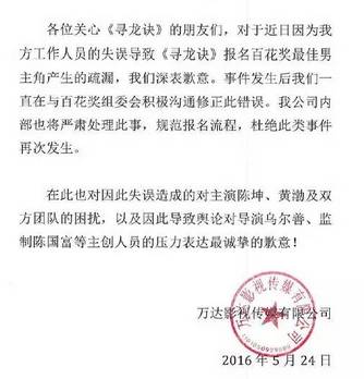 乌尔善(导演):《寻龙诀》从筹备到上映,历经几年时间,不管是电影里的角色,还是电影外的主创,大家都是这部电影的亲人。最近几天,我们不断听到关于百花奖提名的消息,原本大家应该因为《寻龙诀》提名最多而感到开心,但是提名名单中独漏了胡八一,这让大家的情绪从开心变成错愕,所有的提名者也都感到意外,作为导演,我觉得很遗憾,希望报名单位能够对工作程序进行检查,对情况进行说明。这样才不辜负《寻龙诀》所有幕前幕后的团队,以及所有片方工作人员为电影付出的辛勤努力。