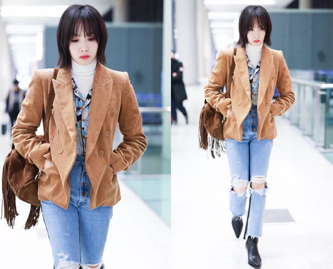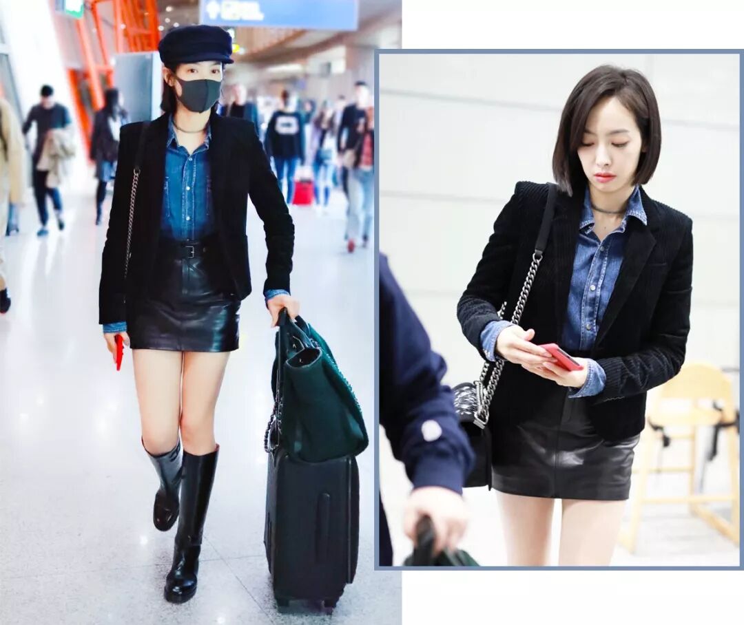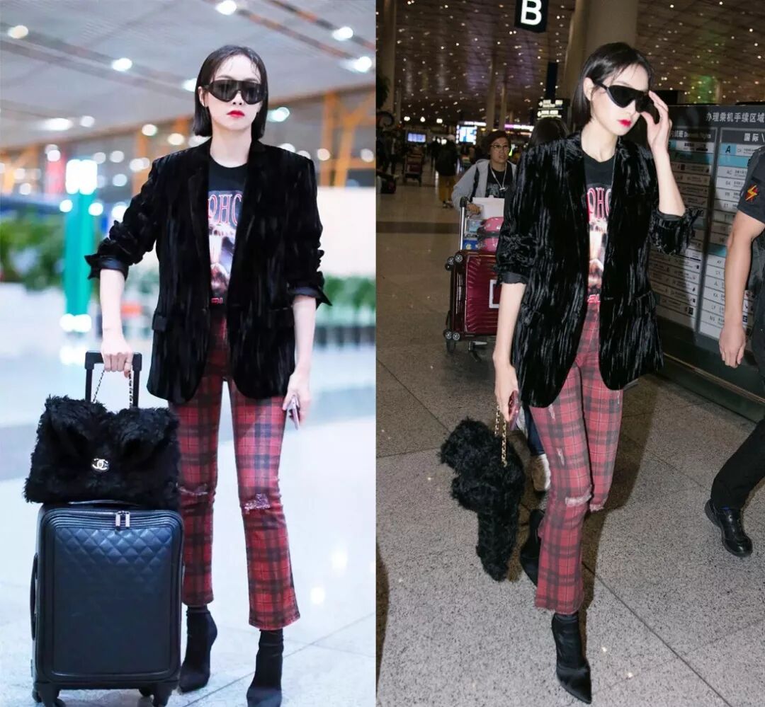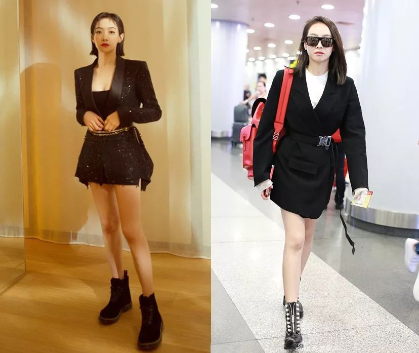 而想要加入街头感的小可爱,可以像宋茜用黑色丝绒西装搭配酷酷的图案T恤,让整个look鲜活起来▼