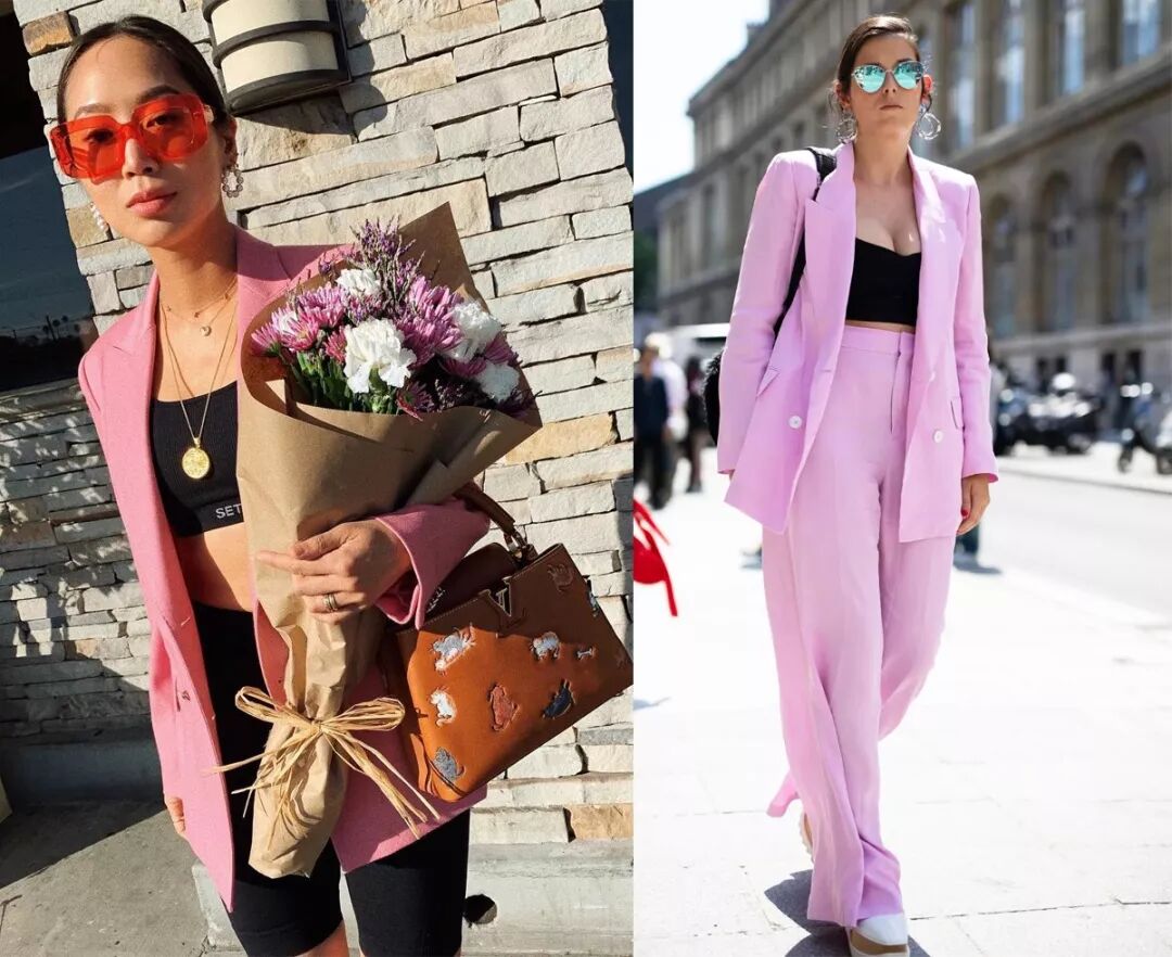 柔粉色的西装搭配黑色抹胸,不会太甜腻也不会太严肃,让你轻松变身时髦精▼
