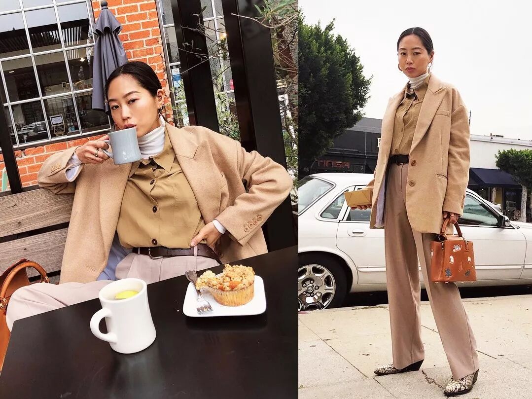 卡其色西装内搭同色系衬衫,无需其他夸张配饰加持就足够气质,很适合穿去喝个下午茶呢▼