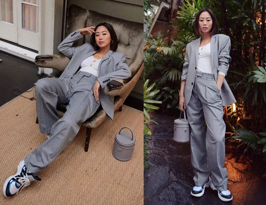 灰色的西服套装怎么穿才有街头感?像时尚博主Aimee Song这样搭配老爹鞋简直chic到不行~▼