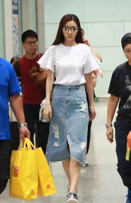 白色的短袖看起来特别的简约风,觉得特别的青春了,尤其是下半身搭配的牛仔的开叉的裙子,特别的减龄的样子了。