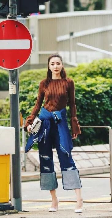 棕色的喇叭袖的毛衣看起来比较的复古,搭配了一条喇叭裤看着很搭配了,而且这个也是最近特别的流行的元素了。