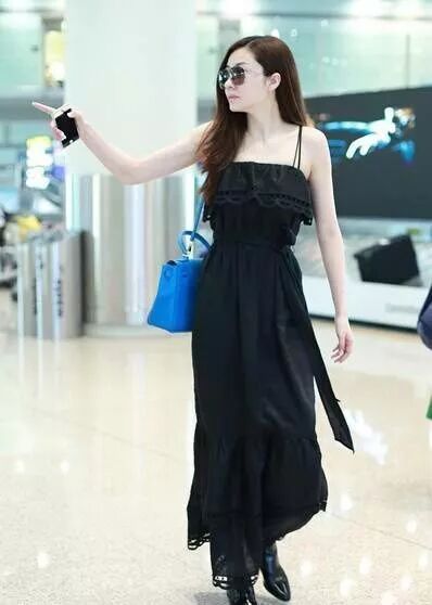 黑色的吊带长裙看起来特别的性感了而且这条裙子非常的显白了,因为是黑色的就更是如此了,蓝色的包比较的提气质了