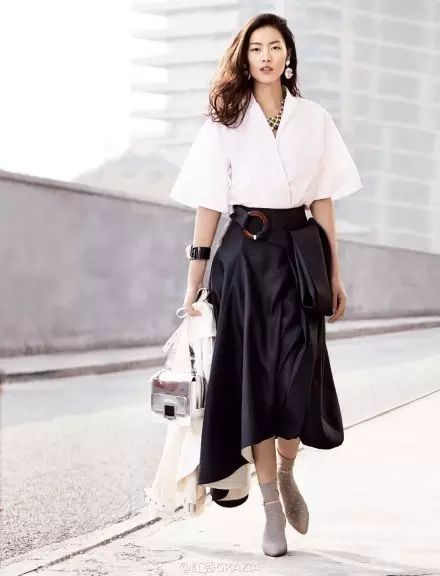 比如说菱形脸的刘涛,穿这件有系带的设计感上衣,成功让视线转移,凸起的颧骨也就消失了。