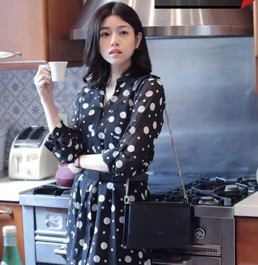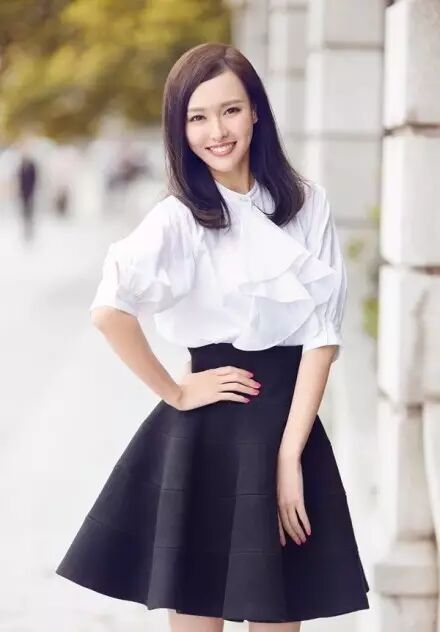 圆脸型适合一些斜切线、挂脖款式,比如下面戚薇的斜肩装和陈妍希的抹胸夏装,是不是很美呢?