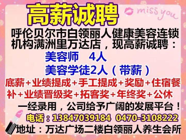 想了解更多满洲里市出租、出售、住宅、门市、商铺、招聘、商业推广、广告宣传等分类信息请点击上方蓝字关注“满洲里市诚信广告平台”客服电话及微信15049028088。本平台只负责提供文字、图片信息及他人联系方式,使用信息时请您认真核对。(未经许可,不得复制转载发布此平台信息,否则后果自负,并有权追究法律责任,谢谢)