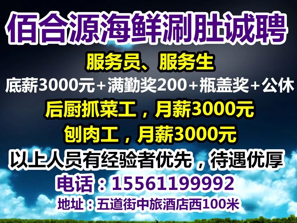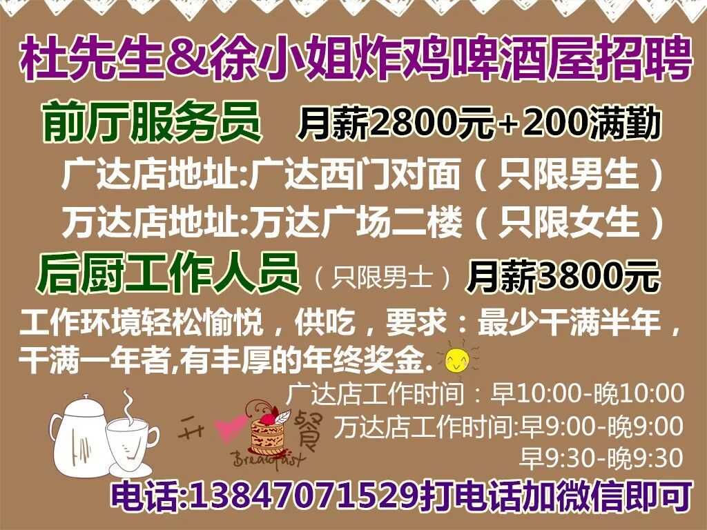 服务员(生)10名:工资3000+200满勤+提成休息)要求年龄18一28岁之间,口齿伶俐,应变能力强